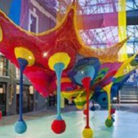 The product for climbing is suspended like a colorful spider’s web use the upstairs space, an architectural marvel made of rope. Complete with spider-egg-sac-like ball swings near the floor, and portals to interior sliding tubes, the mesh of sensory provocation affords children the chance to work out their wiggles and learn through play.